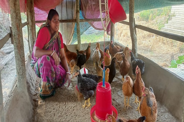 In Purba Sripatinagar village, Sheuli Karan faced tough times because of the land’s problems and the harsh weather. She used to grow crops but couldn’t earn much money. So, she decided to raise chickens instead.